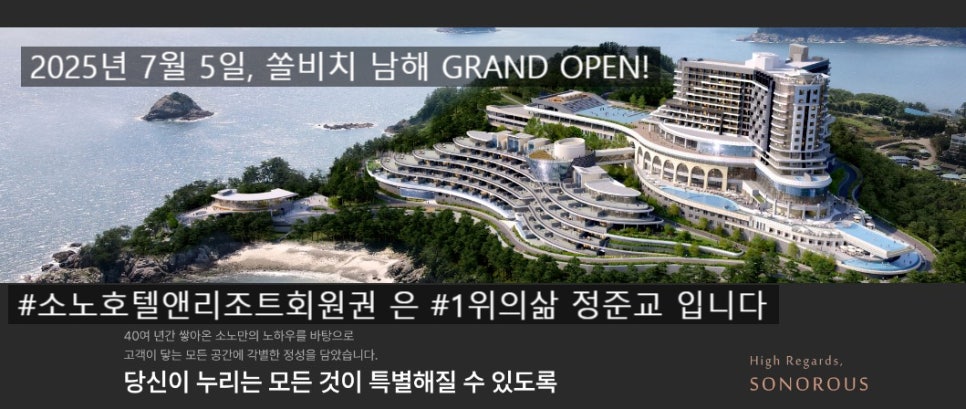 | 소노호텔앤리조트 소노리움17, 소노러스, 노블리안블랙 회원권으로 쏠비치남해, 이 멋진 곳을 특별한 가격에 이용하는 방법? (1) | 2025.05.23 |