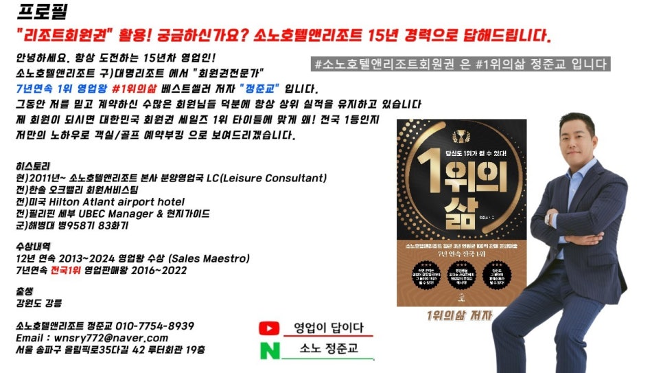 소노호텔앤리조트 분양영업국 7년연속 전국1위 1위의삶 영업왕 정준교 레저컨설턴트 입니다. 010-7754-8939 상시문의가능