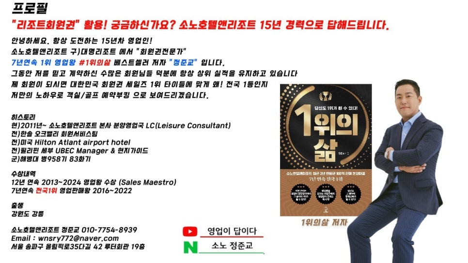 소노호텔앤리조트 분양영업국 7년연속 전국1위 1위의삶 영업왕 정준교 레저컨설턴트 입니다. 010-7754-8939 상시문의가능