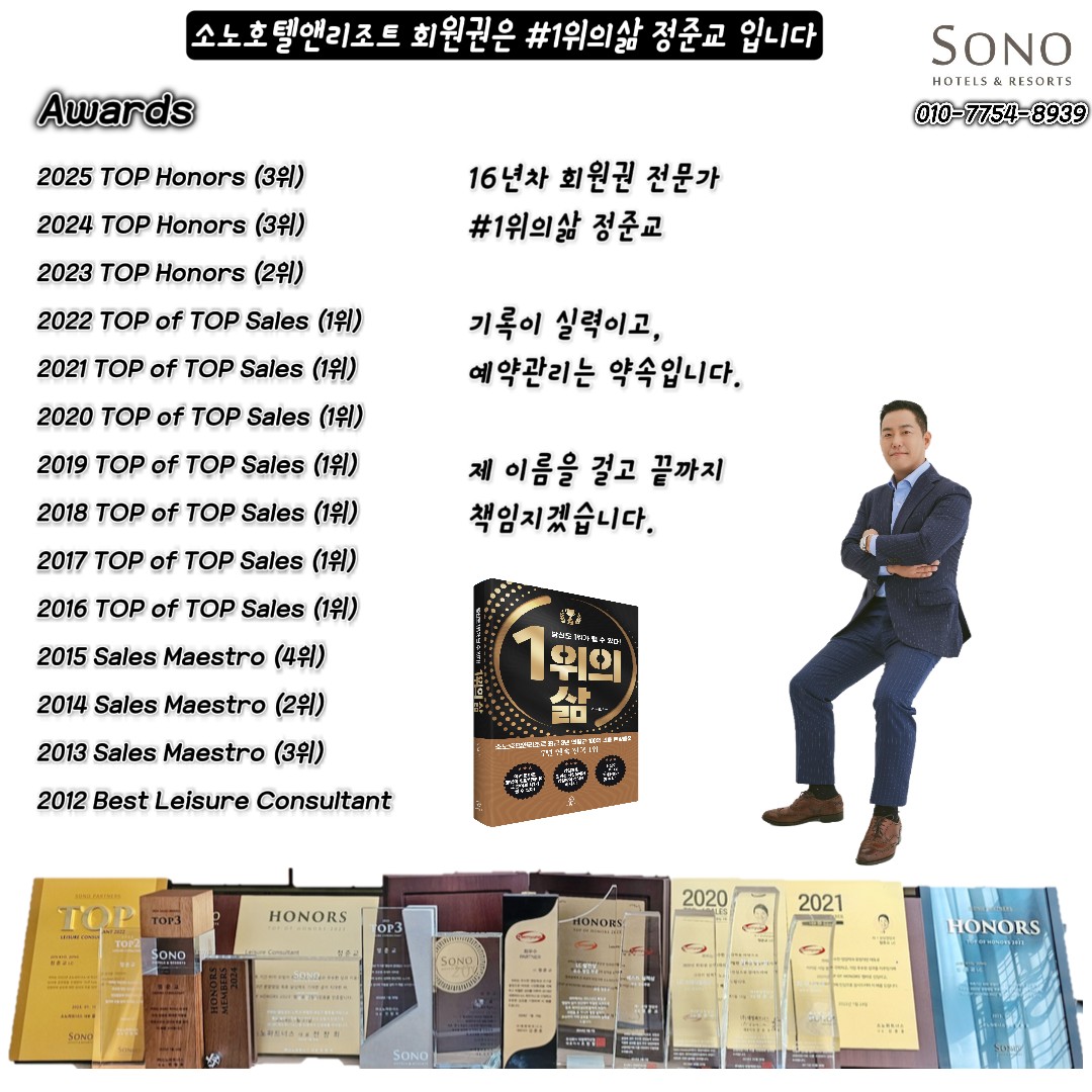 소노호텔앤리조트 16년차 회원권 전문가,7년연속 전국1위 1위의삶 저자 정준교입니다.